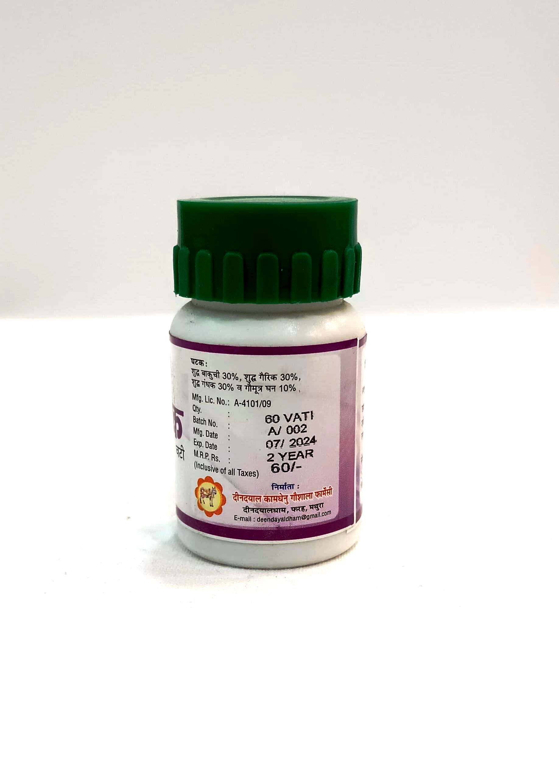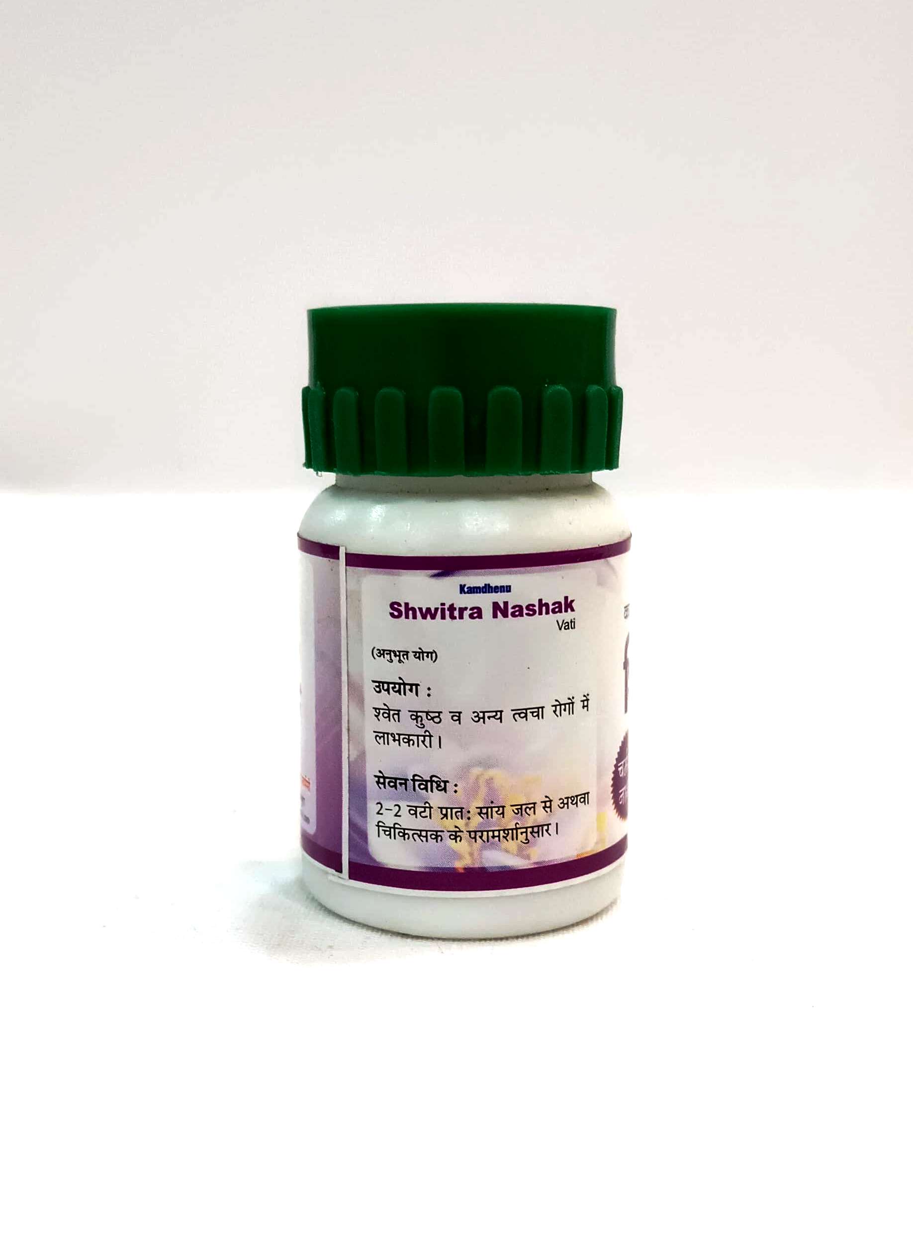 The ingredients of Switra nashak vati may vary depending on the manufacturer, but commonly include herbs such as bakuchi (Psoralea corylifolia), neem (Azadirachta indica), khadira (Acacia catechu), and giloy (Tinospora cordifolia). These herbs are believed to have anti-inflammatory, immunomodulatory, and antioxidant properties, which may help to improve skin health and reduce the symptoms of skin diseases.
